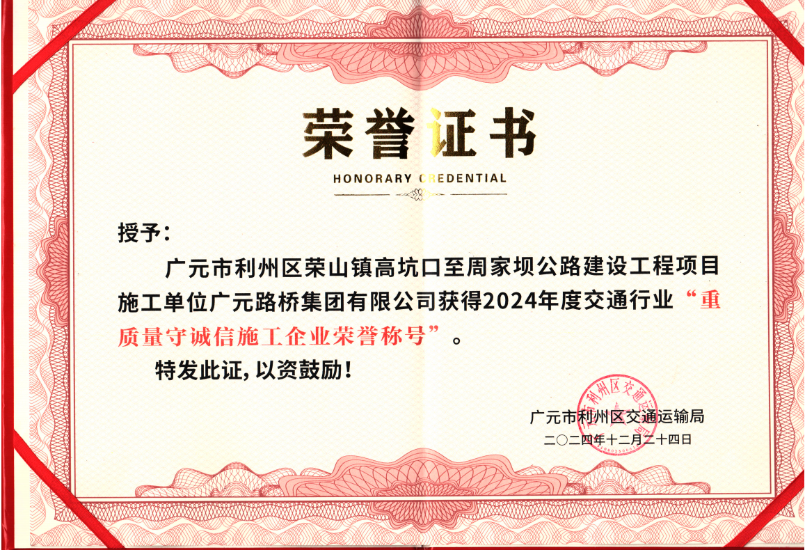 2024年12月24日,路橋集團受到利州區(qū)交通運輸局表揚,榮獲“2024年度交通行業(yè)重質(zhì)量守誠信施工企業(yè)”榮譽稱號,路橋集團榮山鎮(zhèn)高坑口至周家壩項目部在工程建設全過程中,始終以認真細致、嚴謹高效的工作態(tài)度完成各項施工任務,以實際行動詮釋“重質(zhì)量、守誠信”的精神內(nèi)涵。