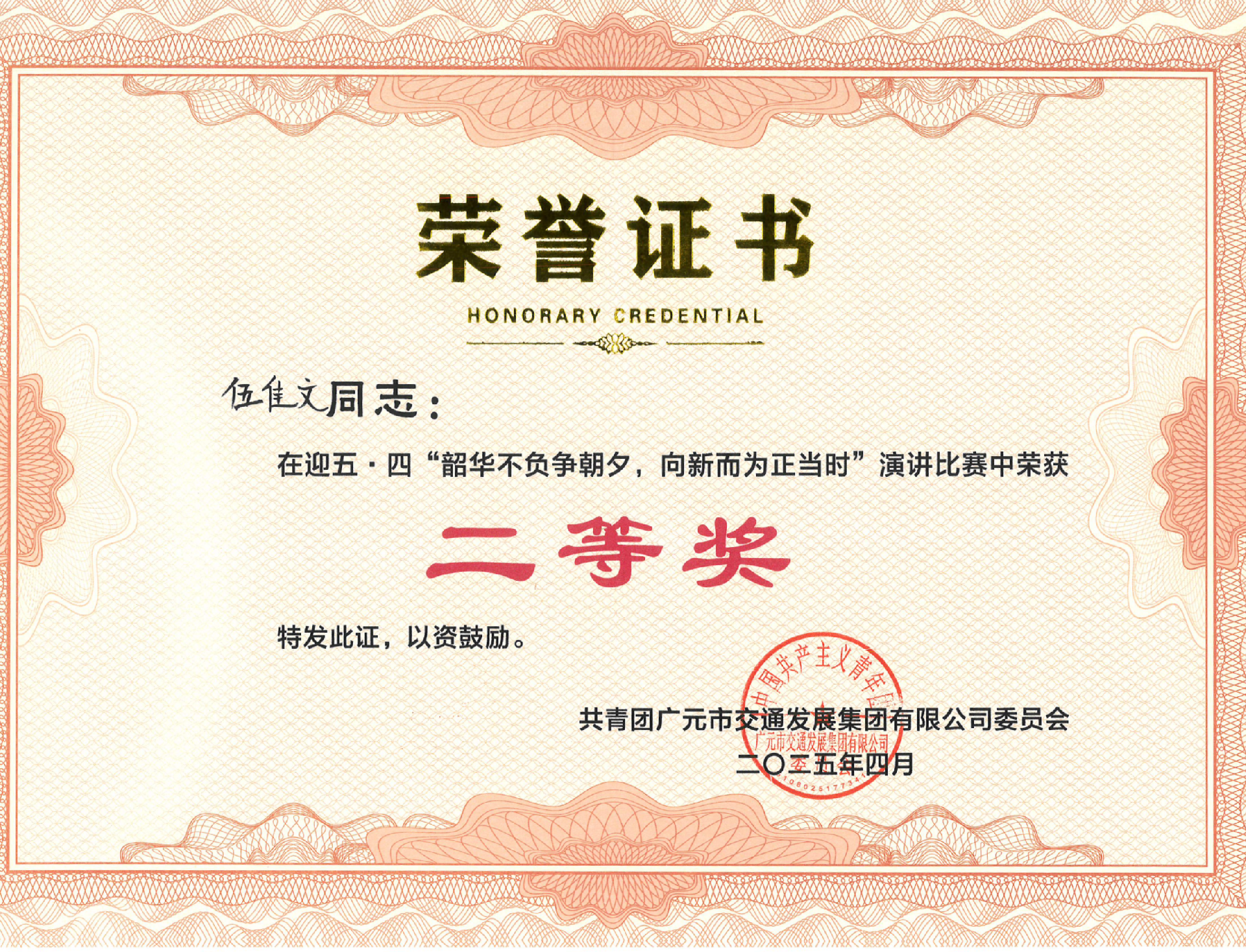 為弘揚五四精神,匯聚青春正能量,4月27日,市交發(fā)集團舉辦“韶華不負爭朝夕?向新而為正當時”演講比賽,路橋集團伍佳文同志歷經初賽和復賽兩輪激烈比拼,以優(yōu)異表現(xiàn)突出重圍,昂首挺進決賽。
