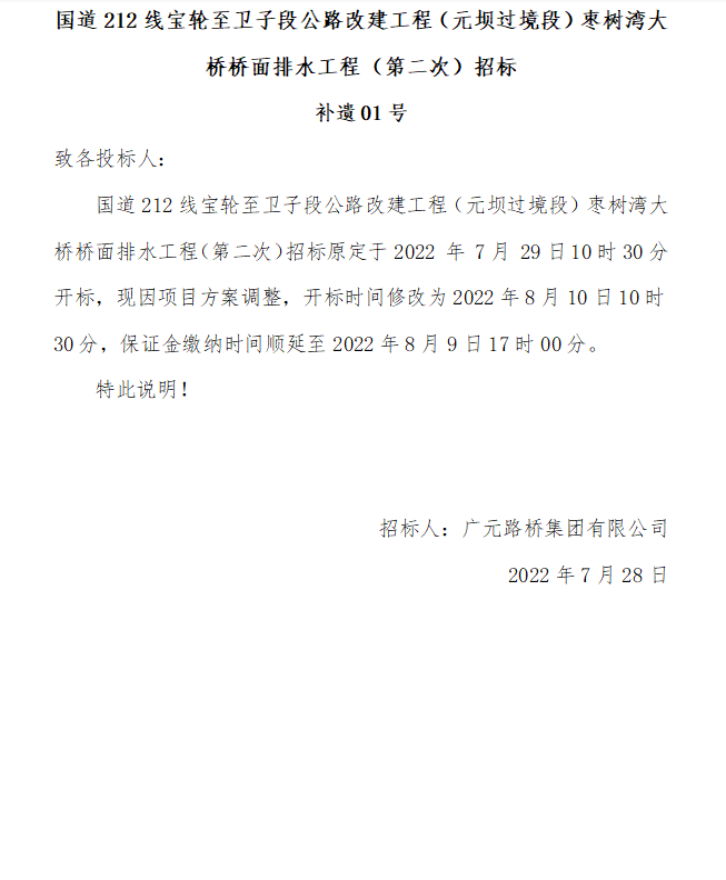 國道212線寶輪至衛(wèi)子段公路改建工程(元壩過境段)棗樹灣大橋橋面排水工程(第二次)招標 補遺01號